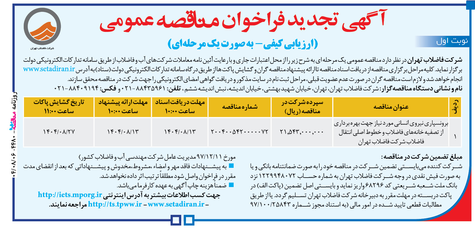 شركت فاضلاب تهران در نظر دارد مناقصه عمومی یک مرحله ای به شرح زیر را از محل اعتبارات جاری و با رعايت آئین نامه معاملات شرکتهای آب و فاضلاب از طریق سامانه تدارکات الکترونیکی دولت برگزار نماید. کلیه مراحل برگزاری مناقصه از دریافت اسناد مناقصه تا ارائه پیشنهاد مناقصه گران و گشایش پاکت ها از طریق درگاه سامانه تدارکات الکترونیکی دولت (ستاد) به آدرس www.setadiran.ir انجام خواهد شد و لازم است مناقصه گران در صورت عدم عضویت قبلی، مراحل ثبت نام در سایت مذکور و دریافت گواهی امضای الکترونیکی را جهت شرکت در مناقصه محقق سازند.