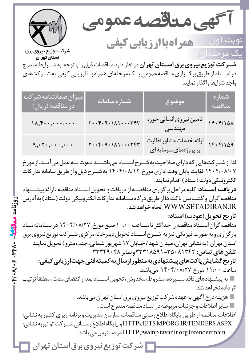 شركت توزيع نيروي برق استان تهران در نظر دارد مناقصات ذیل را با توجه به شرایط مندرج در اسناد از طريق برگزاری مناقصه عمومي یک مرحله اي همراه با ارزیابی کیفی به شركت های واجد شرايط واگذار نمايد.