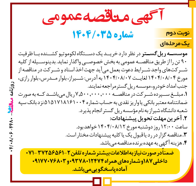 موسسه ریلگستر در نظر دارد خرید یک دستگاه لکوموتیو کشنده با ظرفیت ۹۰ تن را از طریق مناقصه عمومی به بخش خصوصی واگذار نماید. بدینوسیله از کلیه شرکتهای واجد شرایط دعوت بعمل میآید جهت اخذ اسناد و شرکت در مناقصه از مورخ ۰۴/۰۸/۱۴۰۴ لغایت ۰۷/۰۸/۱۴۰۴ به آدرس: شیراز، بلوار مدرس، بلوار رازی، جنب امداد خودرو، موسسه ریلگسترمراجعه نمایند.