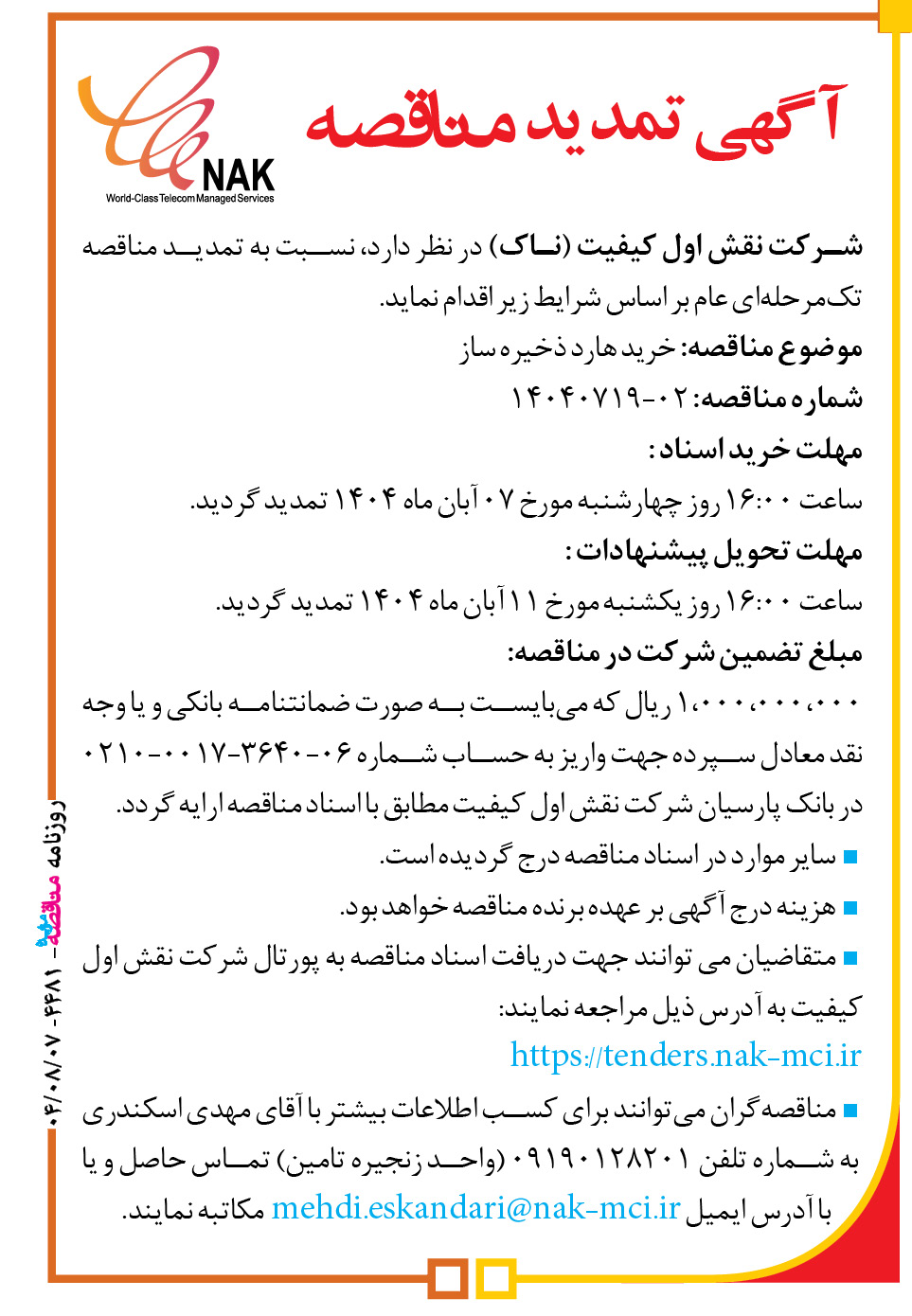 مناقصه گران میتوانند برای کسب اطلاعات بیشتر با آقای مهدی اسکندری به شماره تلفن ۰۹۱۹۰۱۲۸۲۰۱ (واحد زنجیره تامین) تماس حاصل و یا با آدرس ایمیل mehdi.eskandari@nak-mci.ir مکاتبه نمایند.