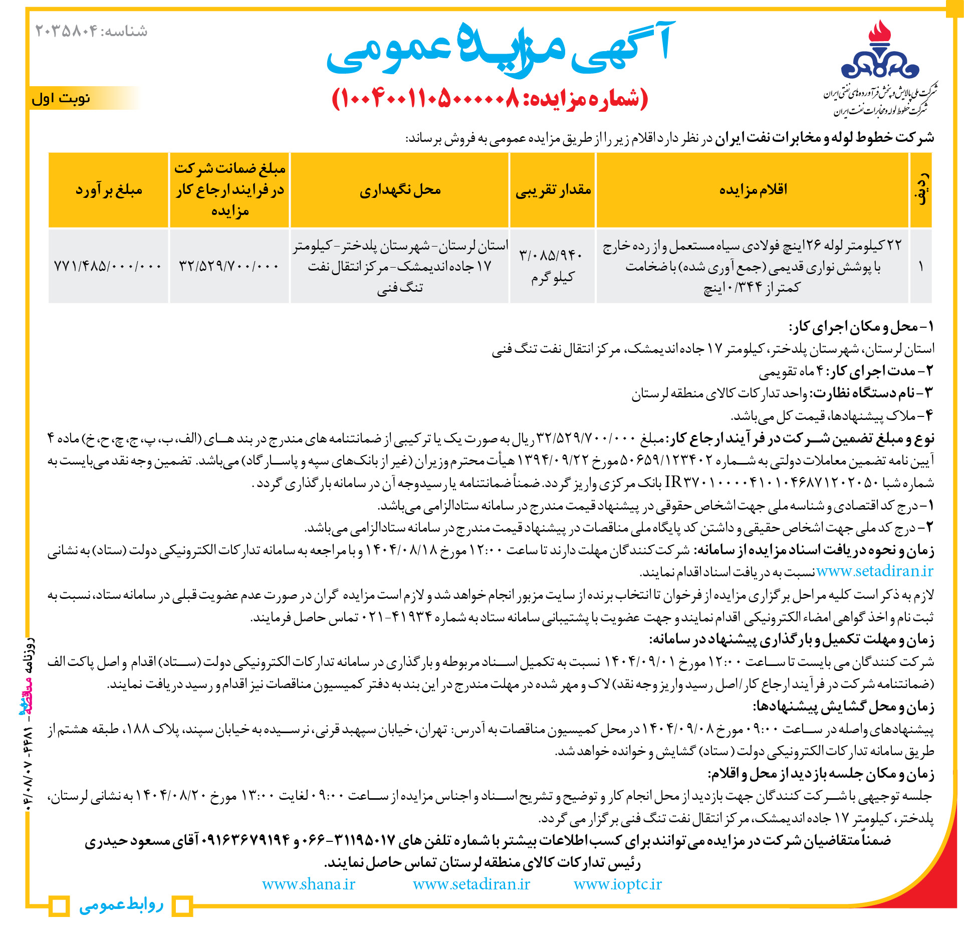 جلسه توجيهي با شركت كنندگان جهت بازديد از محل انجام كار و توضیح و تشریح اسناد و اجناس مزايده از ساعت ۰۹:۰۰ لغایت ۱۳:۰۰ مورخ ۲۰/۰۸/۱۴۰۴ به نشاني لرستان، پلدختر، کیلومتر ۱۷ جاده اندیمشک، مرکز انتقال نفت تنگ فنی برگزار مي گردد.