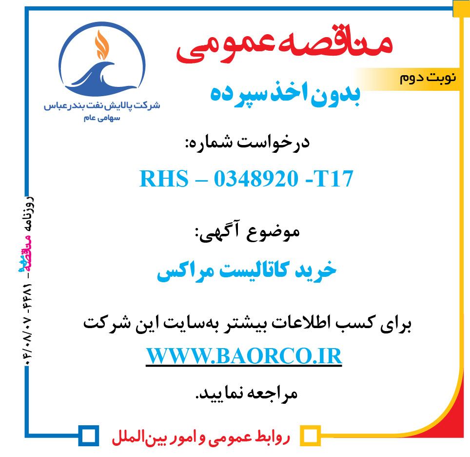 اگهی مناقصه عمومی بدون اخذ سپرده درخواست شماره: RHS – ۰۳۴۸۹۲۰ -T17 موضوع آگهی: خرید کاتالیست مراکس برای کسب اطلاعات بیشتر به سایت این شرکت WWW.BAORCO.IR مراجعه نمایید. روابط عمومی و امور بین الملل