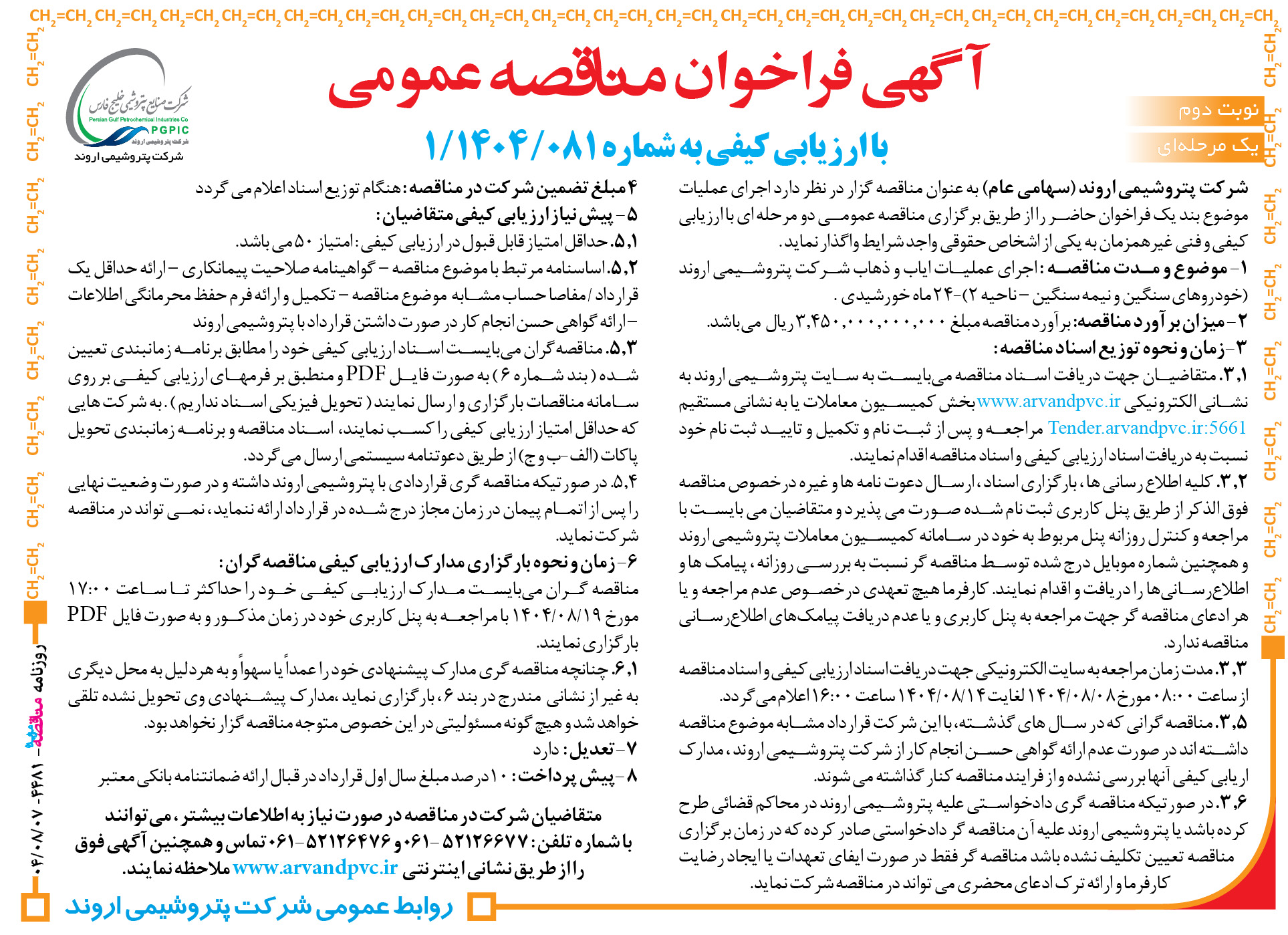 فراخوان مناقصه عمومی یک مرحله ای با ارزیابی کیفی به شماره ۰۸۱/۱۴۰۴/۱ شرکت پتروشیمی اروند (سهامی عام) به عنوان مناقصه گزار در نظر دارد اجرای عملیات موضوع بند یک فراخوان حاضر را از طریق برگزاری مناقصه عمومی دو مرحله ای با ارزیابی کیفی و فنی غیرهمزمان به یکی از اشخاص حقوقی واجد شرایط واگذار نماید […]