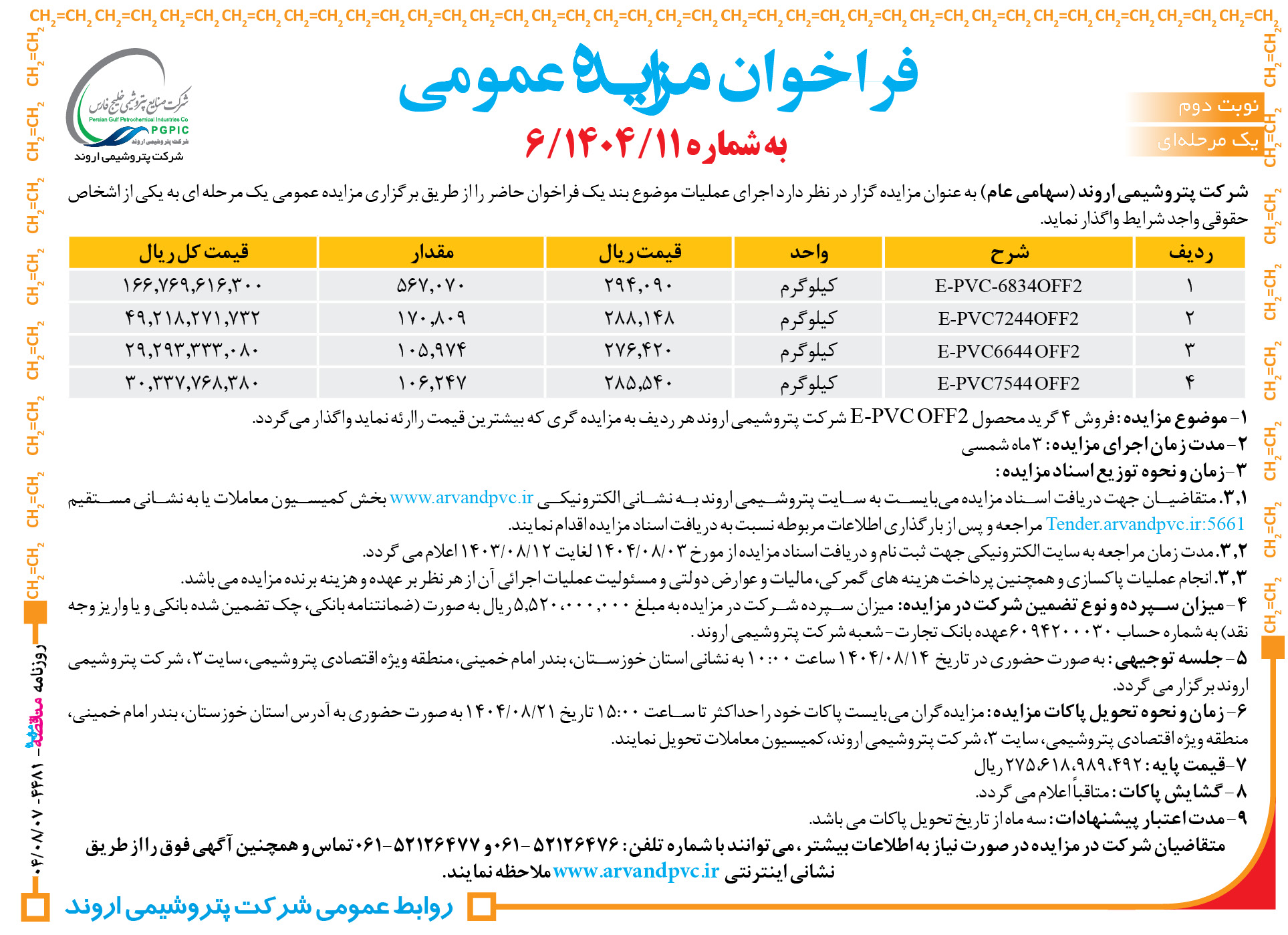 ۱- موضوع مزایده : فروش ۴ گرید محصول E-PVC OFF2 شرکت پتروشیمی اروند