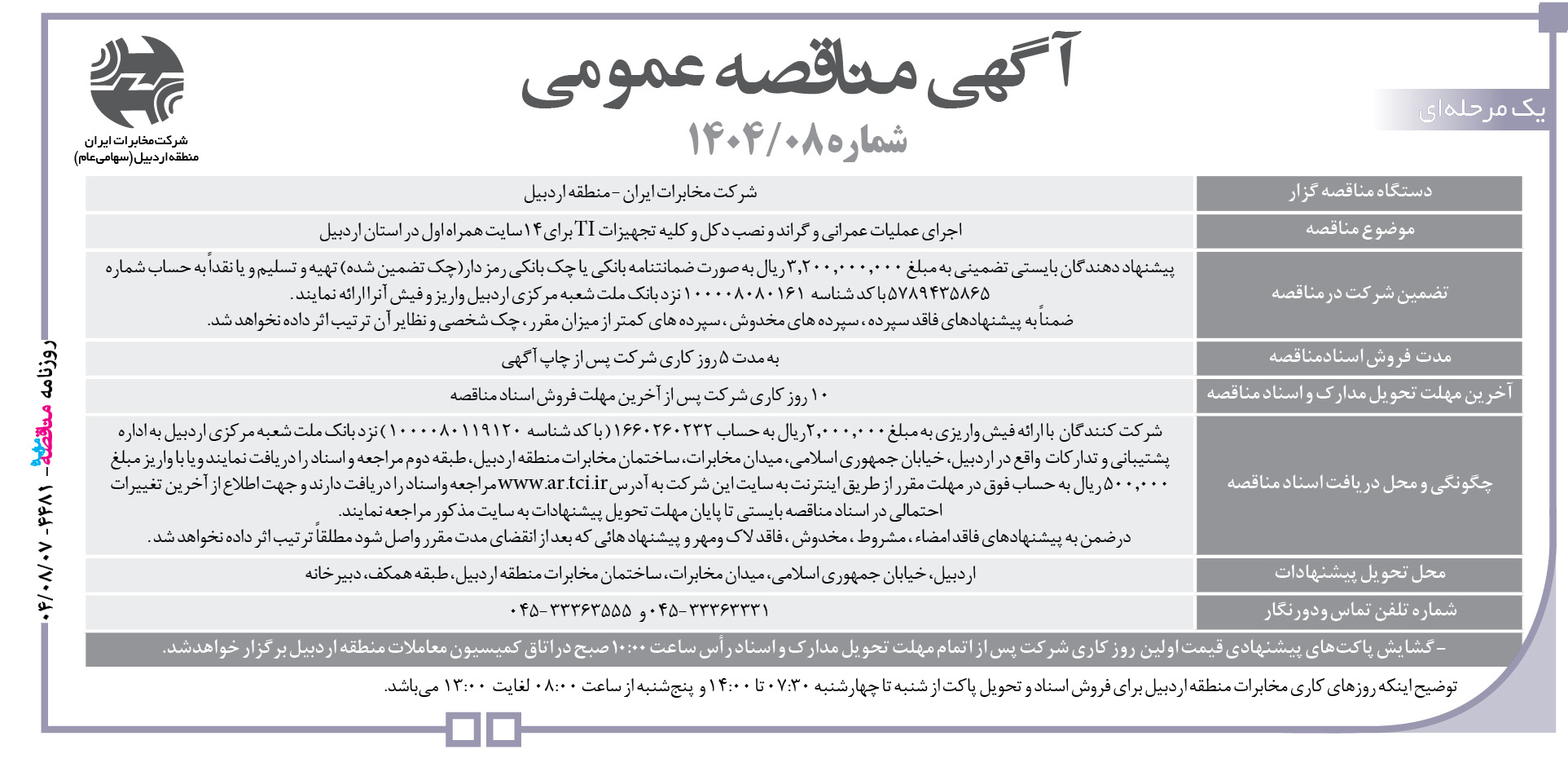 آگهی مناقصه عمومی یک مرحله ای شماره ۰۸/۱۴۰۴ دستگاه مناقصه گزار شرکت مخابرات ايران – منطقه اردبيل موضوع مناقصه اجرای عملیات عمرانی و گراند و نصب دکل و کلیه تجهیزات TI برای۱۴سایت همراه اول در استان اردبیل تضمين شرکت درمناقصه پيشنهاد دهندگان بايستی تضمينی به مبلغ ۳٫۲۰۰٫۰۰۰٫۰۰۰ ریال به صورت ضمانتنامه بانکی يا چک […]