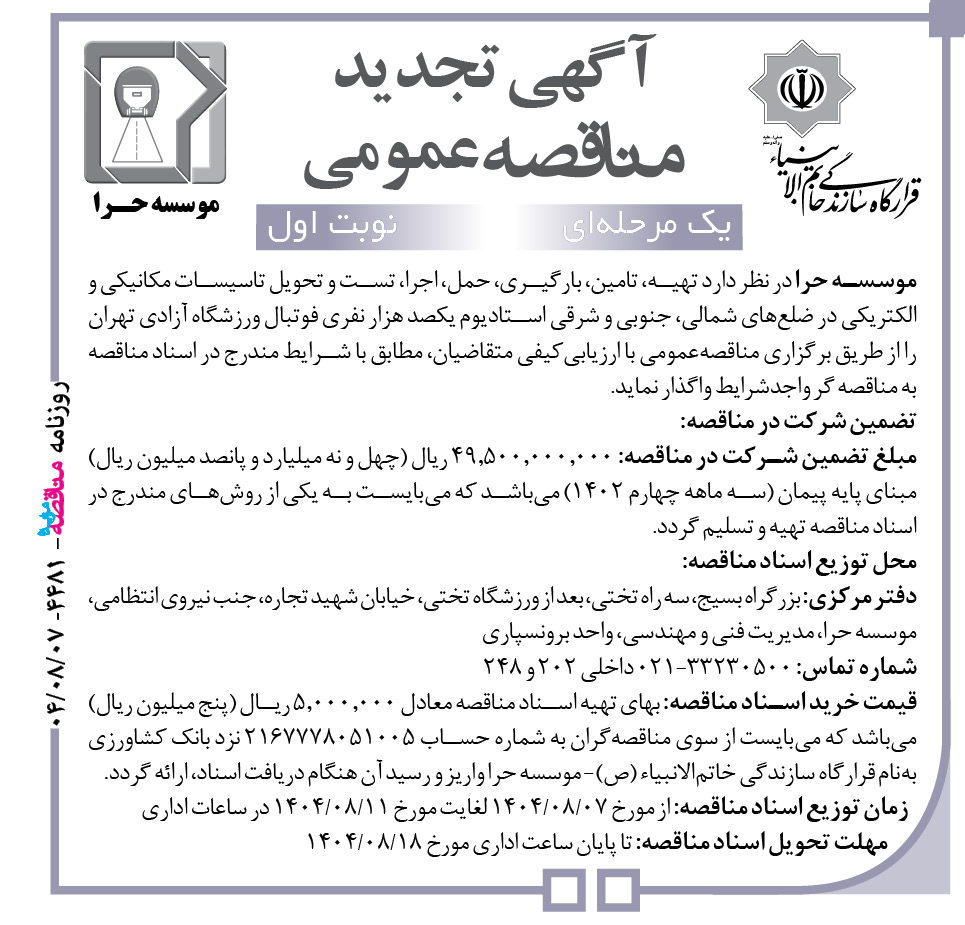 موسسه حرا در نظر دارد تهیه، تامین، بارگیری، حمل، اجرا، تست و تحویل تاسیسات مکانیکی و الکتریکی در ضلعهای شمالی، جنوبی و شرقی استادیوم یکصد هزار نفری فوتبال ورزشگاه آزادی تهران را از طریق برگزاری مناقصهعمومی با ارزیابیکیفی متقاضیان، مطابق با شرایط مندرج در اسناد مناقصه به مناقصه گر واجدشرایط واگذار نماید.