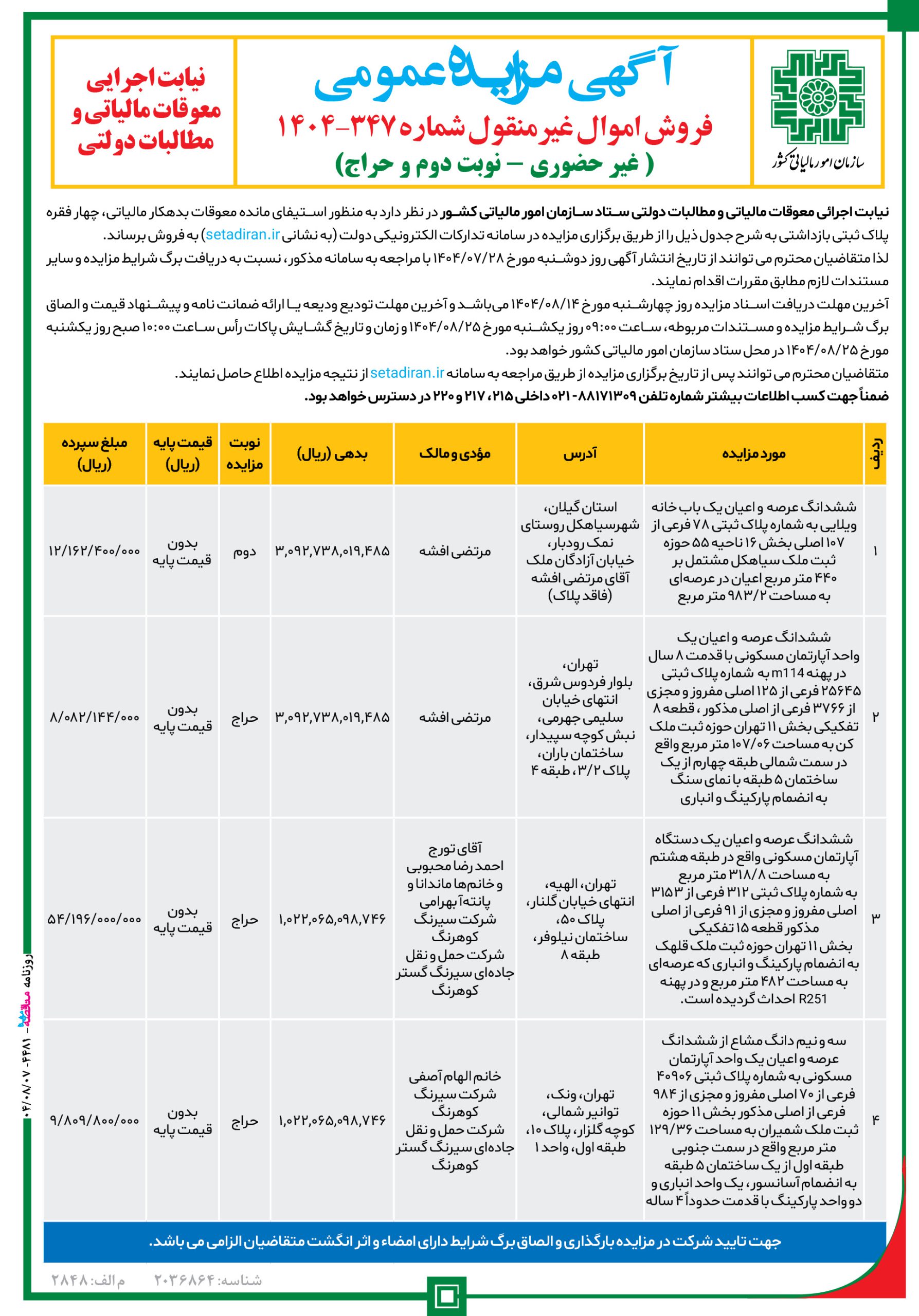 نیابت اجرائی معوقات مالیاتی و مطالبات دولتی ستاد سازمان امور مالیاتی کشور در نظر دارد به منظور استیفای مانده معوقات بدهکار مالیاتی، چهار فقره پلاک ثبتی بازداشتی به شرح جدول ذیل را از طریق برگزاری مزایده در سامانه تدارکات الکترونیکی دولت (به نشانی setadiran.ir) به فروش برساند. لذا متقاضیان محترم می توانند از تاریخ انتشار آگهی روز دوشنبه مورخ ۲۸/۰۷/۱۴۰۴ با مراجعه به سامانه مذکور، نسبت به دریافت برگ شرایط مزایده و سایر مستندات لازم مطابق مقررات اقدام نمایند. آخرین مهلت دریافت اسناد مزایده روز چهارشنبه مورخ ۱۴/۰۸/۱۴۰۴ می باشد و آخرین مهلت تودیع ودیعه یا ارائه ضمانت نامه و پیشنهاد قیمت و الصاق برگ شرایط مزایده و مستندات مربوطه، ساعت ۰۹:۰۰ روز یکشنبه مورخ ۲۵/۰۸/۱۴۰۴ و زمان و تاریخ گشایش پاکات رأس ساعت ۱۰:۰۰ صبح روز یکشنبه مورخ ۲۵/۰۸/۱۴۰۴ در محل ستاد سازمان امور مالیاتی کشور خواهد بود. متقاضیان محترم می توانند پس از تاریخ برگزاری مزایده از طریق مراجعه به سامانه setadiran.ir از نتیجه مزایده اطلاع حاصل نمایند. ضمناً جهت کسب اطلاعات بیشتر شماره تلفن ۸۸۱۷۱۳۰۹- ۰۲۱ داخلی ۲۱۵، ۲۱۷ و ۲۲۰ در دسترس خواهد بود.
