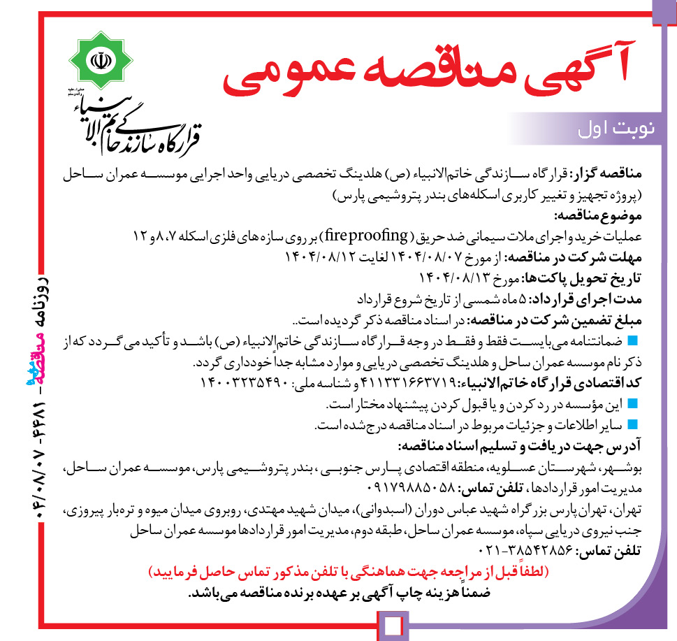 آگهي مناقصه عمومی نوبت دوم مناقصه گزار: قرارگاه سازندگی خاتمالانبیاء (ص) هلدینگ تخصصی دریایی واحد اجرایی موسسه عمران ساحل (پروژه تجهیز و تغییر کاربری اسکلههای بندر پتروشیمی پارس) موضوع مناقصه: اجرای عملیات تخریب، خاکبرداری، اصلاح و بازسازی پول پیت و اجرای کابل ۱۲۰*۳ مهلت شرکت در مناقصه: از مورخ ۰۳/۰۸/۱۴۰۴ لغايت ۰۵/۰۸/۱۴۰۴ تاريخ تحويل پاکتها: […]