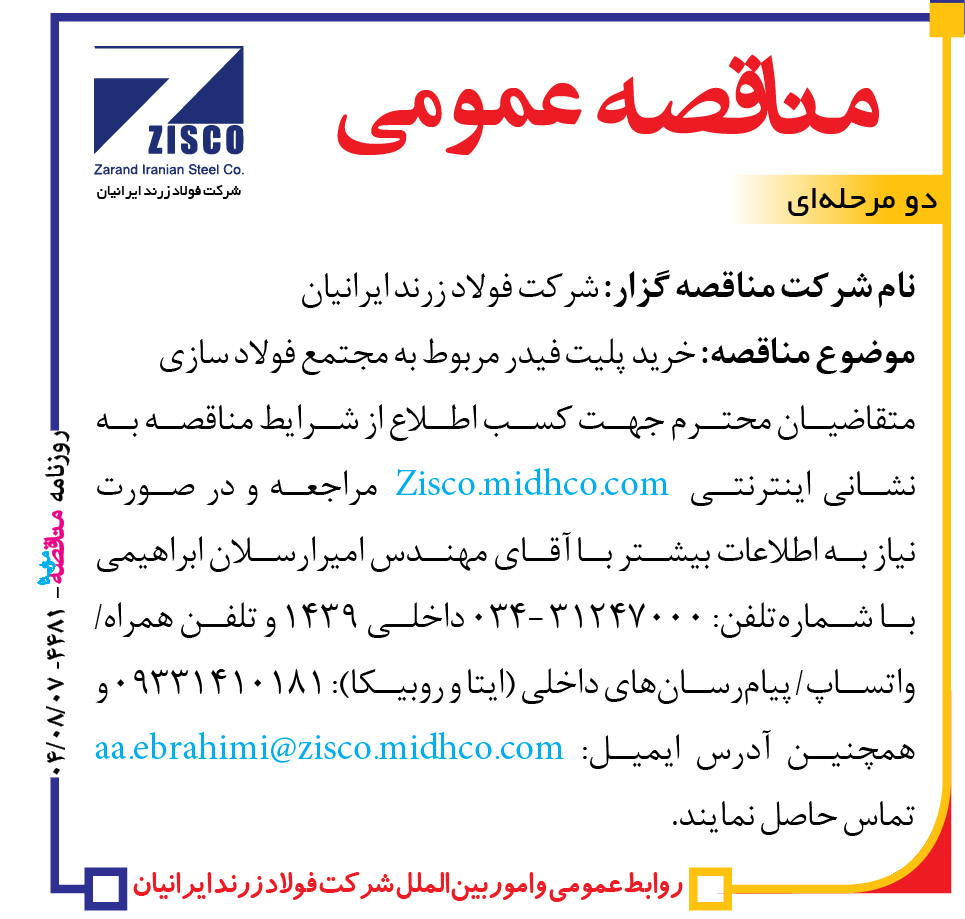 نام شرکت مناقصه گزار : شرکت فولاد زرند ایرانیان