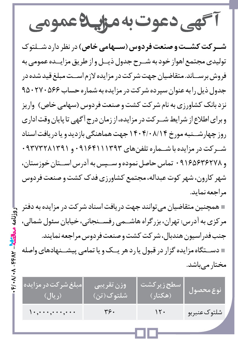 شرکت کشت و صنعت فردوس (سهامی خاص) در نظر دارد شلتوک تولیدی مجتمع اهواز خود به شرح جدول ذیل و از طریق مزایده عمومی به فروش برساند. متقاضیان جهت شرکت در مزایده لازم است مبلغ قید شده در جدول ذیل را به عنوان سپرده شرکت در مزایده به شماره حساب ۹۵۰۲۷۰۵۶۶ نزد بانک کشاورزی به نام شرکت کشت و صنعت فردوس (سهامی خاص) واریز و برای اطلاع از شرایط شرکت در مزایده، از زمان درج آگهی تا پایان وقت اداری روز چهارشنبه مورخ ۱۴/۰۸/۱۴۰۴ با شماره تلفنهای ۰۹۱۶۴۱۱۱۳۹۳ و ۰۹۳۷۳۲۸۱۳۹۱ و ۰۹۱۶۵۶۳۶۲۷۸ تماس حاصل نموده و سپس به آدرس استان خوزستان، شهر کارون، شهر کوت عبداله، مجتمع کشاورزی فدک کشت و صنعت فردوس مراجعه نماید.