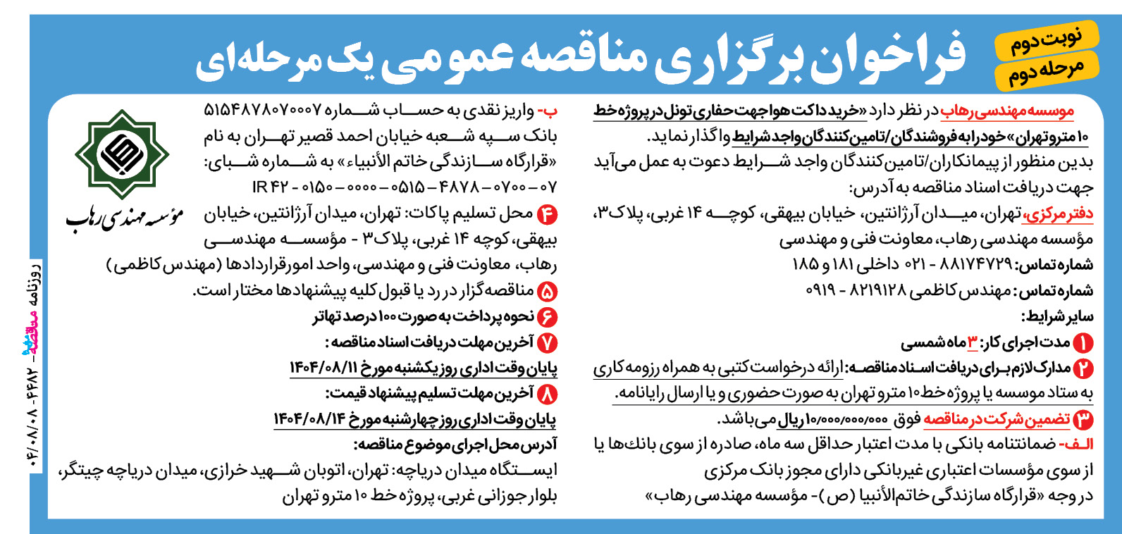 فراخوان برگزاری مناقصه عمومی یک مرحله ای موسسه مهندسی رهاب در نظر دارد « خرید داکت هوا جهت حفاری تونل در پروژه خط ۱۰ مترو تهران » خود را به فروشندگان/تامینکنندگان واجد شرایط واگذار نماید. بدین منظور از پیمانکاران/تامینکنندگان واجد شرایط دعوت بعمل میآید جهت دریافت اسناد مناقصه به آدرس: دفتر مرکزی، تهران، میدان آرژانتین، […]
