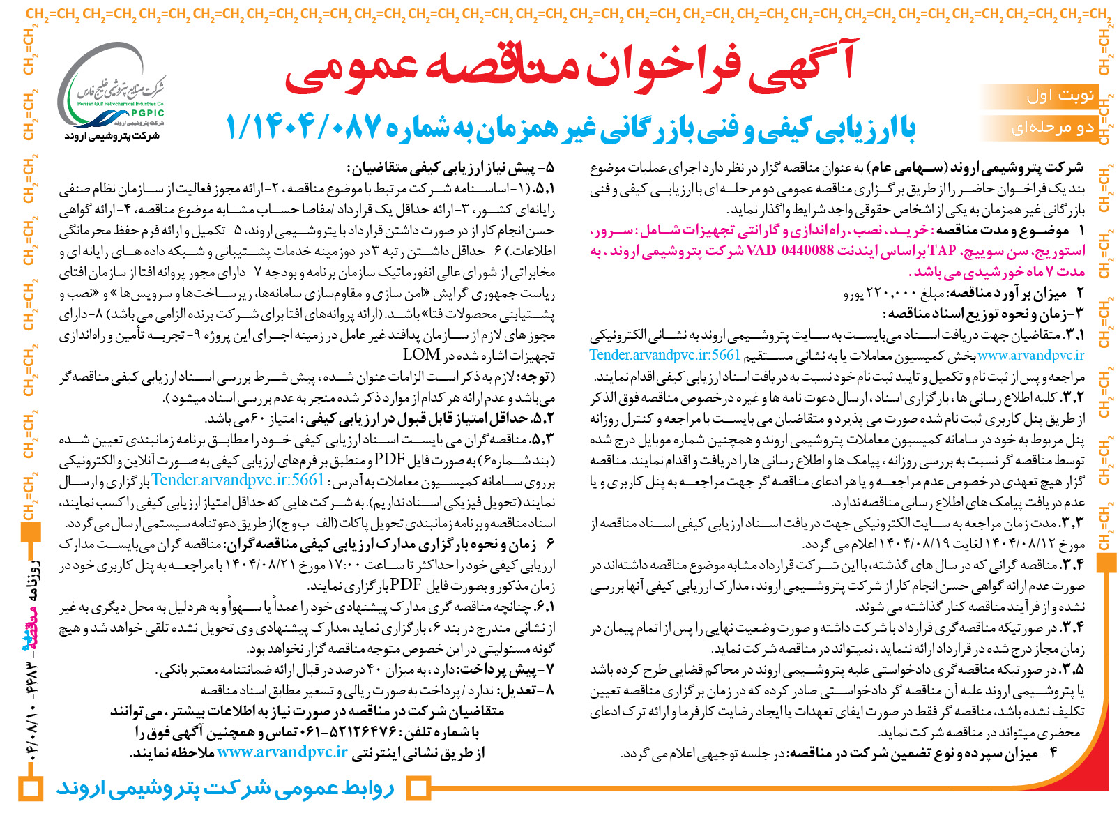 متقاضیان شرکت در مناقصه در صورت نیاز به اطلاعات بیشتر ، میتوانند با شماره تلفن : ۵۲۱۲۶۴۷۶-۰۶۱ تماس و همچنین آگهی فوق را از طریق نشانی اینترنتی www.arvandpvc.irملاحظه نمایند.