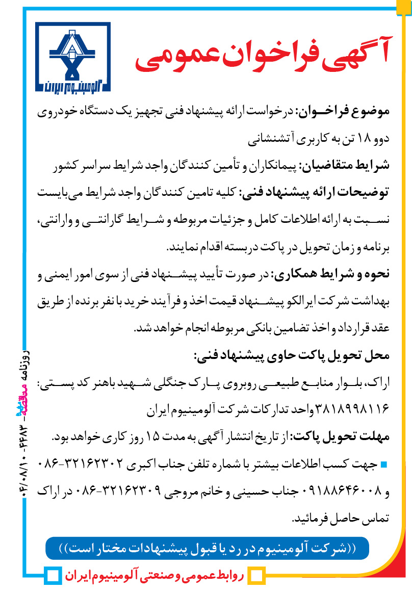محل تحویل پاکت حاوی پیشنهاد فنی: اراک، بلوار منابع طبیعی روبروی پارک جنگلی شهید باهنر کد پستی: ۳۸۱۸۹۹۸۱۱۶ واحد تدارکات شرکت آلومینیوم ایران