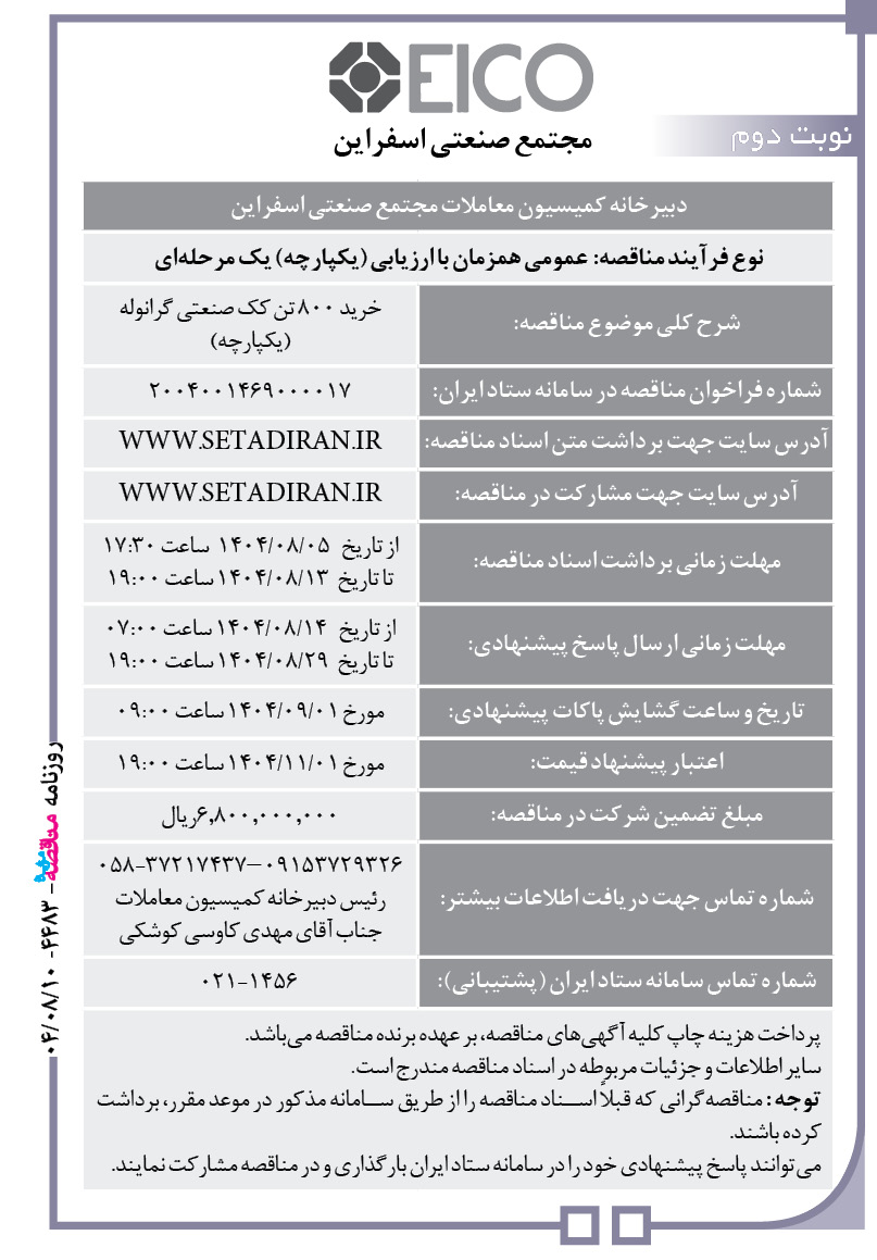 دبیرخانه کمیسیون معاملات مجتمع صنعتی اسفراین نوع فرآیند مناقصه: عمومی همزمان با ارزیابی (یکپارچه) یک مرحلهای خرید ۸۰۰ تن کک صنعتی گرانوله (یکپارچه) شرح کلی موضوع مناقصه: ۲۰۰۴۰۰۱۴۶۹۰۰۰۰۱۷ شماره فراخوان مناقصه در سامانه ستاد ایران: WWW.SETADIRAN.IR آدرس سایت جهت برداشت متن اسناد مناقصه: WWW.SETADIRAN.IR آدرس سایت جهت مشارکت در مناقصه: از تاریخ ۰۵/۰۸/۱۴۰۴ ساعت ۱۷:۳۰ […]