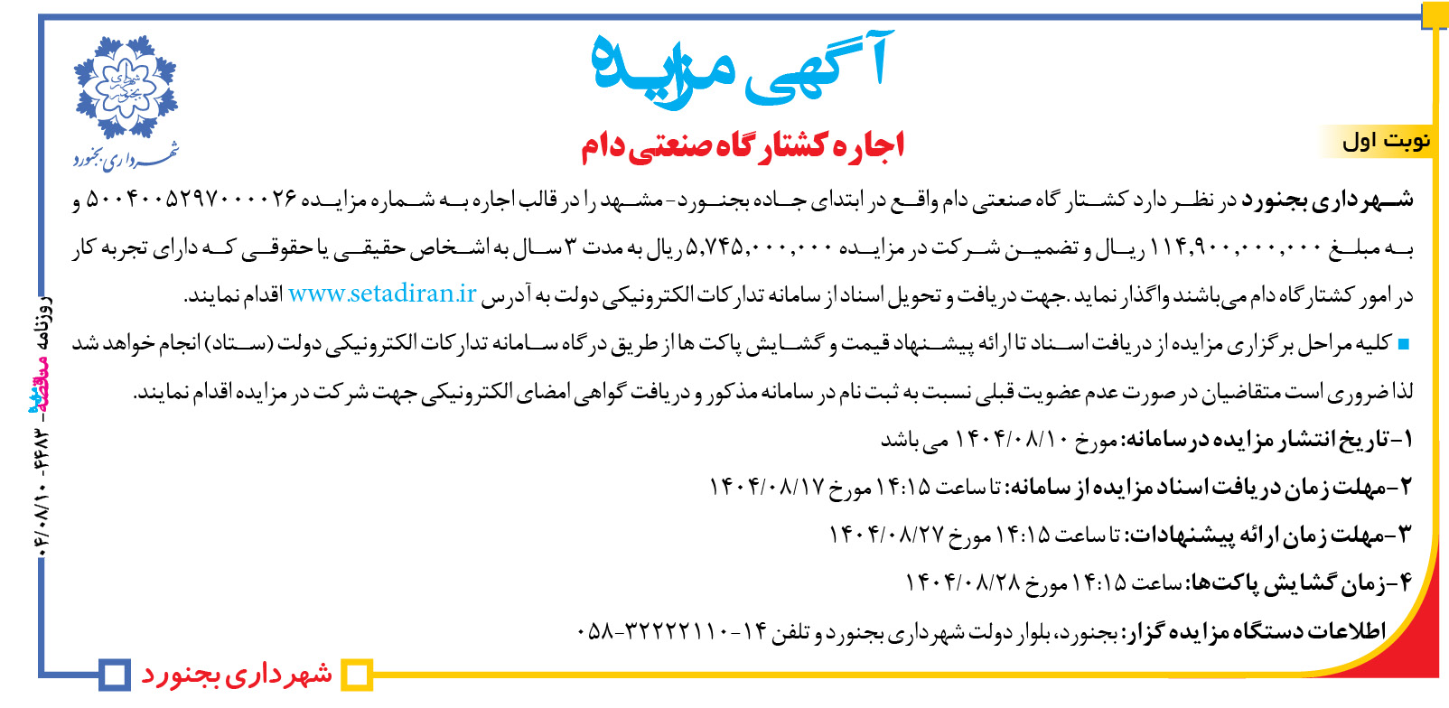 اطلاعات دستگاه مزایده گزار: بجنورد، بلوار دولت شهرداری بجنورد و تلفن ۱۴-۳۲۲۲۲۱۱۰-۰۵۸