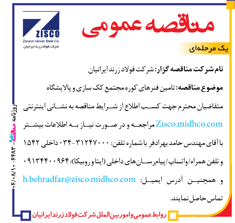 موضوع مناقصه: تامین فنرهای کوره مجتمع کک سازی و پالایشگاه متقاضیان محترم جهت کسب اطلاع از شرایط مناقصه به نشانی اینترنتی Zisco.midhco.comمراجعه و در صورت نیاز به اطلاعات بیشتر با آقای مهندس حامد بهرادفر با شماره تلفن: ۳۱۲۴۷۰۰۰ -۰۳۴ داخلی ۱۵۴۲ و تلفن همراه/واتساپ/پیامرسانهای داخلی (ایتا و روبیکا): ۰۹۱۳۴۴۰۰۹۶۴ و همچنین آدرس ایمیل: h.behradfar@zisco.midhco.com تماس حاصل نمایند.