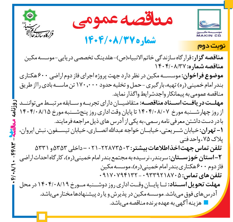 مناقصه گزار:قرارگاه سازندگی خاتم الانبیاء(ص)- هلدینگ تخصصی دریایی – موسسه مکین مناقصه شماره: ۳۷/۰۸/۱۴۰۴ موضوع فراخوان: موسسه مکین در نظر دارد جهت پروژه اجرای فاز دوم اراضی ۶۰۰ هکتاری بندر امام خمینی (ره) تهیه، بارگیری – حمل و تخلیه حدود ۱۷۰٫۰۰۰ تن ماسه بادی را از طریق مناقصه عمومی به پیمانکار واجدشرایط واگذار نماید. […]