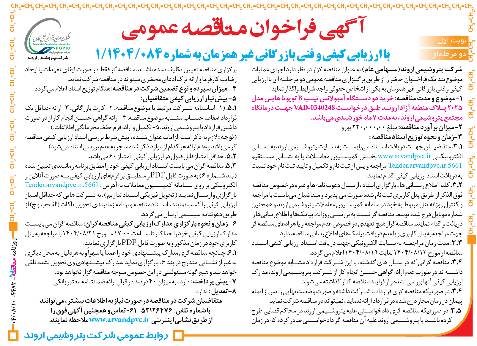 فراخوان مناقصه عمومی دو مرحله ای با ارزیابی کیفی و فنی بازرگانی غیر همزمان به شماره ۰۸۴/۱۴۰۴/۱ شرکت پتروشیمی اروند (سهامی عام) به عنوان مناقصه گزار در نظر دارد اجرای عملیات موضوع بند یک فراخوان حاضر را از طریق برگزاری مناقصه عمومی دو مرحله ای با ارزیابی کیفی و فنی بازرگانی غیر همزمان به یکی […]