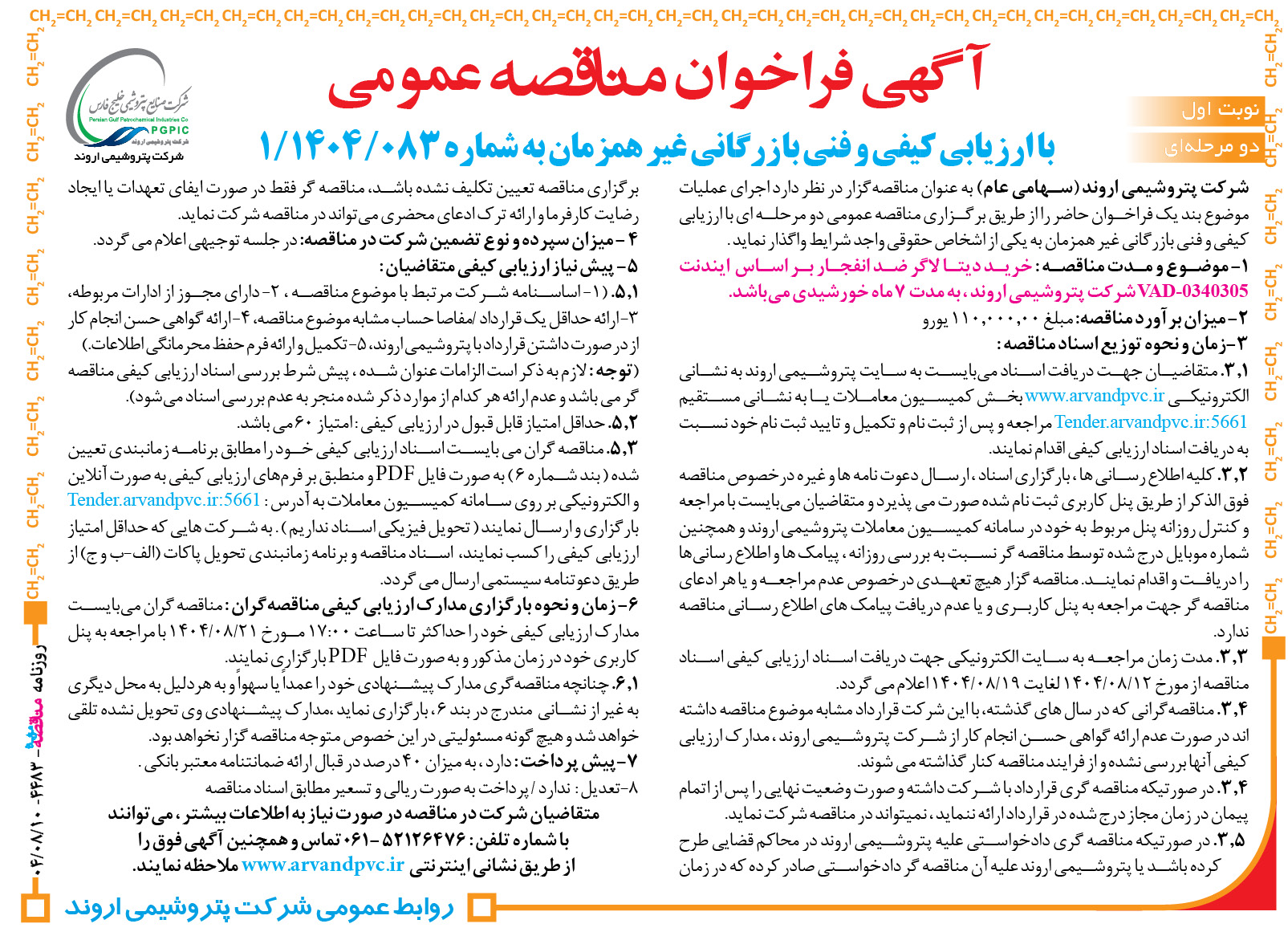 متقاضیان شرکت در مناقصه در صورت نیاز به اطلاعات بیشتر ، میتوانند با شماره تلفن : ۵۲۱۲۶۴۷۶ -۰۶۱ تماس و همچنین آگهی فوق را از طریق نشانی اینترنتی www.arvandpvc.irملاحظه نمایند.