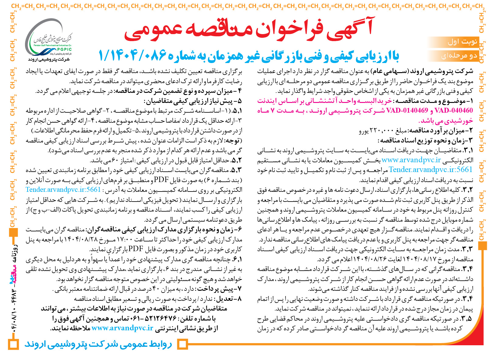 آگهی فراخوان مناقصه عمومی یک مرحله ای با ارزیابی کیفی و فنی غیر همزمان به شماره ۰۷۹/۱۴۰۴/۱ شرکت پتروشیمی اروند (سهامی عام) به عنوان مناقصه گزار در نظر دارد اجرای عملیات موضوع بند یک فراخوان حاضر را از طریق برگزاری مناقصه عمومی یک مرحله ای با ارزیابی کیفی و فنی غیر همزمان به یکی از […]