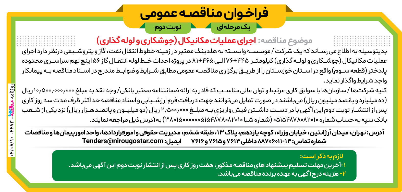 کلیه شرکتها / سازمانها با سوابق کاری مرتبط و توان مالی مناسب که قادر به ارائه ضمانتنامه معتبر بانکی/ وجه نقد به مبلغ ۱۰٫۵۰۰٫۰۰۰٫۰۰۰ ريال (ده میلیارد و پانصد میلیون ريال) میباشند در صورت تمایل میتوانند جهت دریافت فرم ارزشیابی و اسناد مناقصه حداکثر ظرف مدت سه روز کاری پس از انتشار نوبت دوم این آگهی با در دست داشتن فيش واريزي به مبلغ ۲٫۵۰۰٫۰۰۰ ريال (دو میلیون و پانصـد هزار ریال) نزد یکی از شعب بانک سپه به حساب شماره ۰۵۱۵۴۸۷۸۰۸۲۰۱۰ (شماره شبا ۳۸۰۱۵۰۰۰۰۰۰۵۱۵۴۸۷۸۰۸۲۰۱۰) به آدرس ذیل مراجعه نمایند.