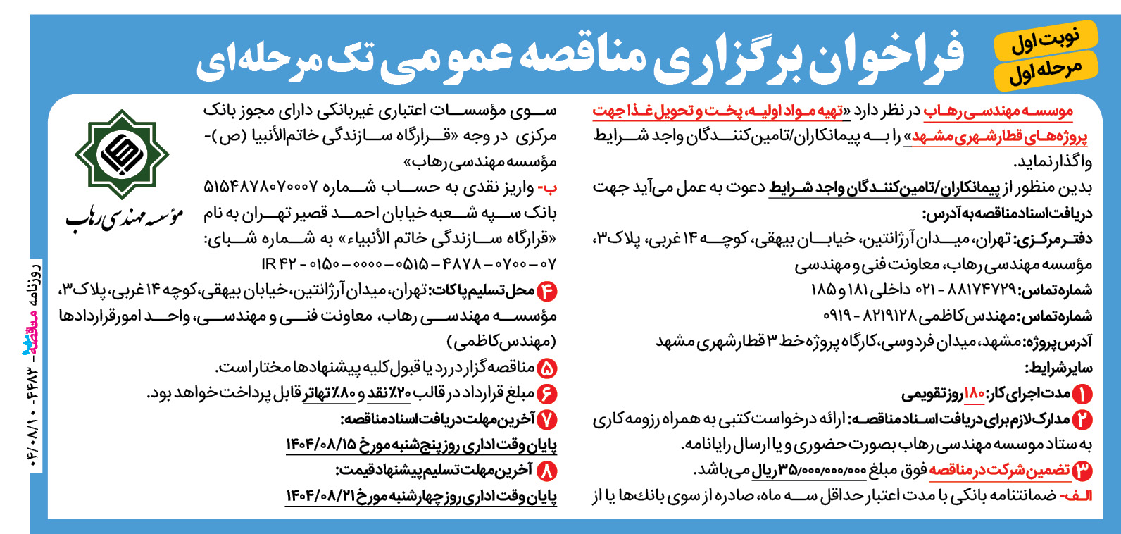 فراخوان برگزاری مناقصه عمومی یک مرحله ای موسسه مهندسی رهاب در نظر دارد «خرید داکت هوا جهت حفاری تونل در پروژه خط ۱۰ مترو تهران » خود را به فروشندگان/تامینکنندگان واجد شرایط واگذار نماید. بدین منظور از پیمانکاران/تامینکنندگان واجد شرایط دعوت به عمل میآید جهت دریافت اسناد مناقصه به آدرس: دفتر مرکزی، تهران، میدان آرژانتین، […]