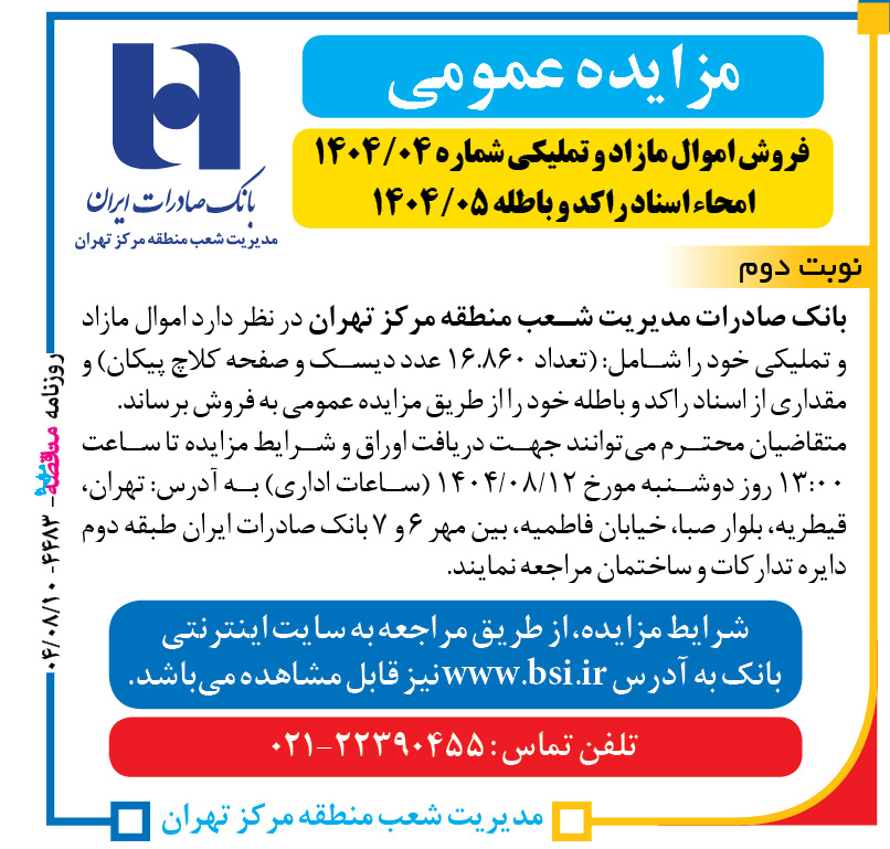بانک صادرات مدیریت شعب منطقه مرکز تهران در نظر دارد اموال مازاد و تملیکی خود را شامل: (تعداد ۱۶.۸۶۰ عدد دیسک و صفحه کلاچ پیکان) و مقداری از اسناد راکد و باطله خود را از طریق مزایده عمومی به فروش برساند. متقاضیان محترم میتوانند جهت دریافت اوراق و شرایط مزایده تا ساعت ۱۳:۰۰ روز دوشنبه مورخ ۱۲/۰۸/۱۴۰۴ (ساعات اداری) به آدرس: تهران، قیطریه، بلوار صبا، خیابان فاطمیه، بین مهر ۶ و ۷ بانک صادرات ایران طبقه دوم دایره تدارکات و ساختمان مراجعه نمایند.