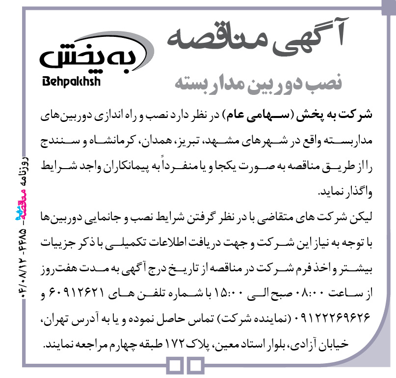 شرکت به پخش (سهامی عام) در نظر دارد نصب و راه اندازی دوربین های مداربسته واقع در شهرهای مشهد، تبریز، همدان، کرمانشاه و سنندج را از طریق مناقصه به صورت یکجا و یا منفرداً به پیمانکاران واجد شرایط واگذار نماید. لیکن شرکت های متقاضی با در نظر گرفتن شرایط نصب و جانمایی دوربین ها با توجه به نیاز این شرکت و جهت دریافت اطلاعات تکمیلی با ذکر جزییات بیشتر و اخذ فرم شرکت در مناقصه از تاریخ درج آگهی بمدت هفت روز از ساعت ۰۸:۰۰ صبح الی ۱۵:۰۰ با شماره تلفن های ۶۰۹۱۲۶۲۱ و ۰۹۱۲۲۲۶۹۶۲۶ (نماینده شرکت) تماس حاصل نموده و یا به آدرس تهران، خیابان آزادی، بلوار استاد معین، پلاک۱۷۲ طبقه چهارم مراجعه نمایند.