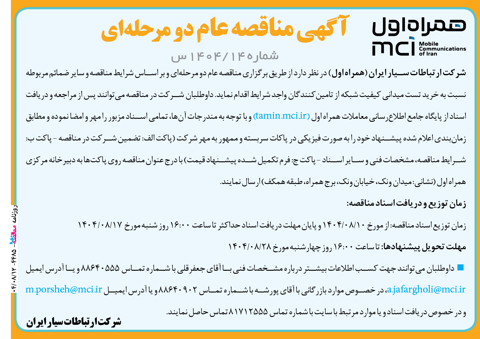 شرکت ارتباطات سیار ایران (همراه اول) در نظر دارد از طریق برگزاری مناقصه عام دو مرحلهای و بر اساس شرایط مناقصه و سایر ضمائم مربوطه نسبت به خرید تست میدانی کیفیت شبکه از تامینکنندگان واجد شرایط اقدام نماید. داوطلبان شرکت در مناقصه میتوانند پس از مراجعه و دریافت اسناد از پایگاه جامع اطلاعرسانی معاملات همراه اول (tamin.mci.ir) و با توجه به مندرجات آنها، تمامی اسناد مزبور را مهر و امضا نموده و مطابق زمانبندی اعلام شده پیشنهاد خود را به صورت فیزیکی در پاکات سربسته و ممهور به مهر شرکت (پاکت الف: تضمین شرکت در مناقصه – پاکت ب: شرایط مناقصه، مشخصات فنی و سایر اسناد – پاکت ج: فرم تکمیل شده پیشنهاد قیمت) با درج عنوان مناقصه روی پاکتها به دبیرخانه مرکزی همراه اول (نشانی: میدان ونک، خیابان ونک، برج همراه، طبقه همکف) ارسال نمایند.