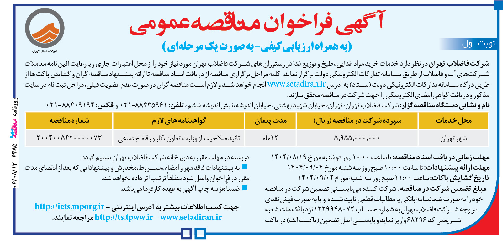 شركت فاضلاب تهران در نظر دارد خدمات خرید مواد غذایی ، طبخ و توزیع غذا در رستوران های شرکت فاضلاب تهران مورد نیاز خود را از محل اعتبارات جاری و با رعايت آئین نامه معاملات شرکتهای آب و فاضلاب از طریق سامانه تدارکات الکترونیکی دولت برگزار نماید. کلیه مراحل برگزاری مناقصه از دریافت اسناد مناقصه تا ارائه پیشنهاد مناقصه گران و گشایش پاکت ها از طریق درگاه سامانه تدارکات الکترونیکی دولت (ستاد) به آدرس www.setadiran.ir انجام خواهد شد و لازم است مناقصه گران در صورت عدم عضویت قبلی، مراحل ثبت نام در سایت مذکور و دریافت گواهی امضای الکترونیکی را جهت شرکت در مناقصه محقق سازند.
