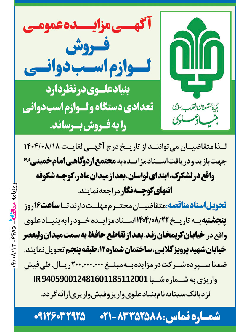 ۴۴۸۵ مزایده – موسسه بنیاد علوی – فروش لوازم اسب دوانی