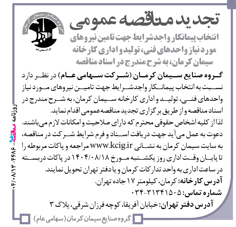 گروه صنایع سیمان کرمان (شرکت سهامی عام) در نظر دارد نسبت به انتخاب پیمانکار واجدشرایط جهت تامین نیروهای مورد نیاز واحدهای فنی، تولید و اداری کارخانه سیمان کرمان، به شرح مندرج در اسناد مناقصه و از طریق برگزاری تجدید مناقصهعمومی اقدام نماید. لذا از کلیه اشخاص حقوقی محترم که دارای صلاحیت و امکانات لازم میباشند. دعوت به عمل میآید جهت دریافت اسناد و فرم شرایط شرکت در مناقصه، به سایت سیمان کرمان به نشانی www.kcig.ir مراجعه و پاکات مربوطه را تا پایان وقت اداری روز یکشنبه مورخ ۱۸/۰۸/۱۴۰۴ در پاکات دربسته در ساعت اداری به واحد تدارکات کرمان و یا دفتر تهران تحویل نمایند.