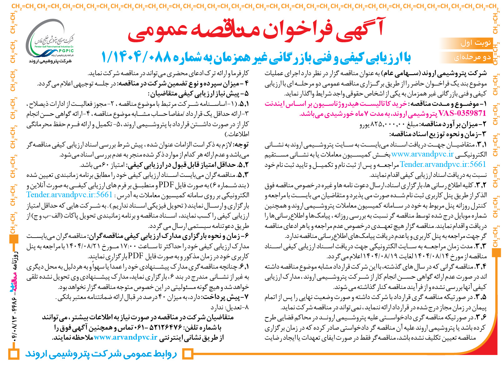 فراخوان مناقصه عمومی دو مرحله ای با ارزیابی کیفی و فنی بازرگانی غیر همزمان به شماره ۰۸۵/۱۴۰۴/۱ شرکت پتروشیمی اروند (سهامی عام) به عنوان مناقصه گزار در نظر دارد اجرای عملیات موضوع بند یک فراخوان حاضر را از طریق برگزاری مناقصه عمومی دو مرحله ای با ارزیابی کیفی و فنی بازرگانی غیر همزمان به یکی […]