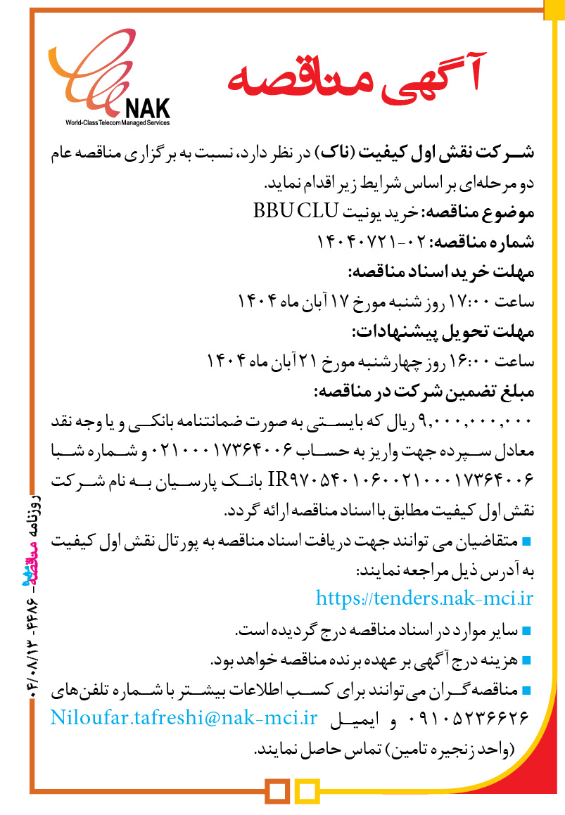 آگهی مناقصه شرکت نقش اول کیفیت (ناک) در نظر دارد، نسبت به برگزاری مناقصه عام دو مرحلهای بر اساس شرایط زیر اقدام نماید. موضوع مناقصه: خرید یونیت BBU CLU شماره مناقصه: ۰۲-۱۴۰۴۰۷۲۱ مهلت خرید اسناد مناقصه: ساعت ۱۷:۰۰ روز شنبه مورخ ۱۷ آبان ماه ۱۴۰۴ مهلت تحویل پیشنهادات: ساعت ۱۶:۰۰ روز چهارشنبه مورخ ۲۱ آبان […]