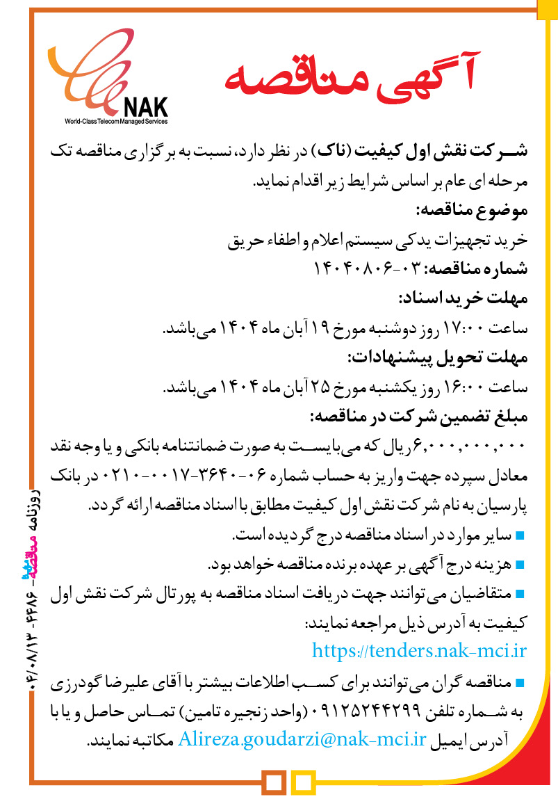 آگهی مناقصه شرکت نقش اول کیفیت (ناک) در نظر دارد، نسبت به برگزاری مناقصه تک مرحله ای عام بر اساس شرایط زیر اقدام نماید. موضوع مناقصه: خرید تجهیزات یدکی سیستم اعلام و اطفاء حریق شماره مناقصه: ۰۳-۱۴۰۴۰۸۰۶ مهلت خرید اسناد: ساعت ۱۷:۰۰ روز دوشنبه مورخ ۱۹ آبان ماه ۱۴۰۴ میباشد. مهلت تحویل پیشنهادات: ساعت ۱۶:۰۰ […]
