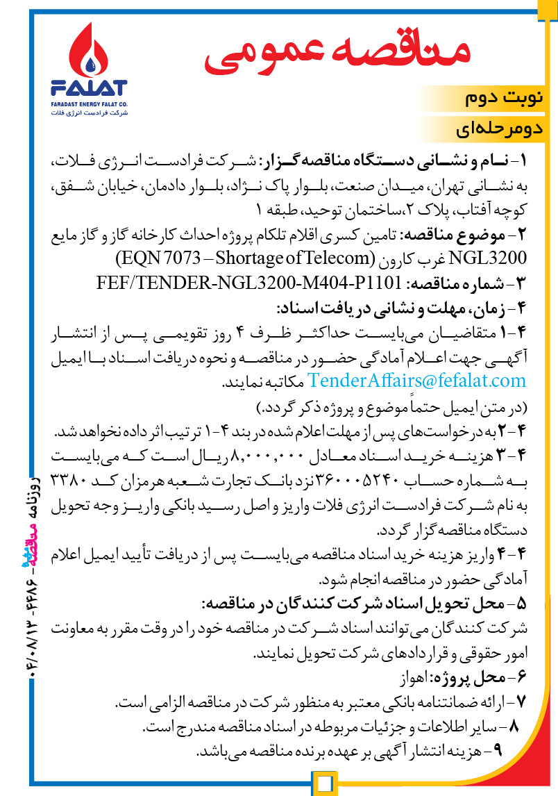 ۴-۱ متقاضیان میبایست حداکثر ظرف ۴ روز تقویمی پس از انتشار آگهی جهت اعلام آمادگی حضور در مناقصه و نحوه دریافت اسناد با ایمیل TenderAffairs@fefalat.com مکاتبه نمایند. (در متن ایمیل حتماً موضوع و پروژه ذکر گردد.)