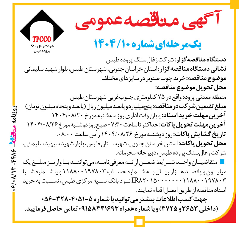 محل تحویل پاکات: استان خراسان جنوبی، شهرستان طبس، بلوار شهید سپهبد سلیمانی، شرکت زغالسنگ پروده طبس، دبیرخانه محرمانه.