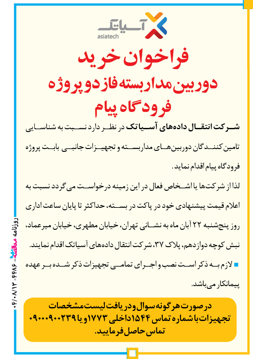 شرکت انتقال دادههای آسیاتک در نظر دارد نسبت به شناسایی تامین کنندگان دوربینهای مداربسته و تجهیزات جانبی بابت پروژه فرودگاه پیام اقدام نماید .