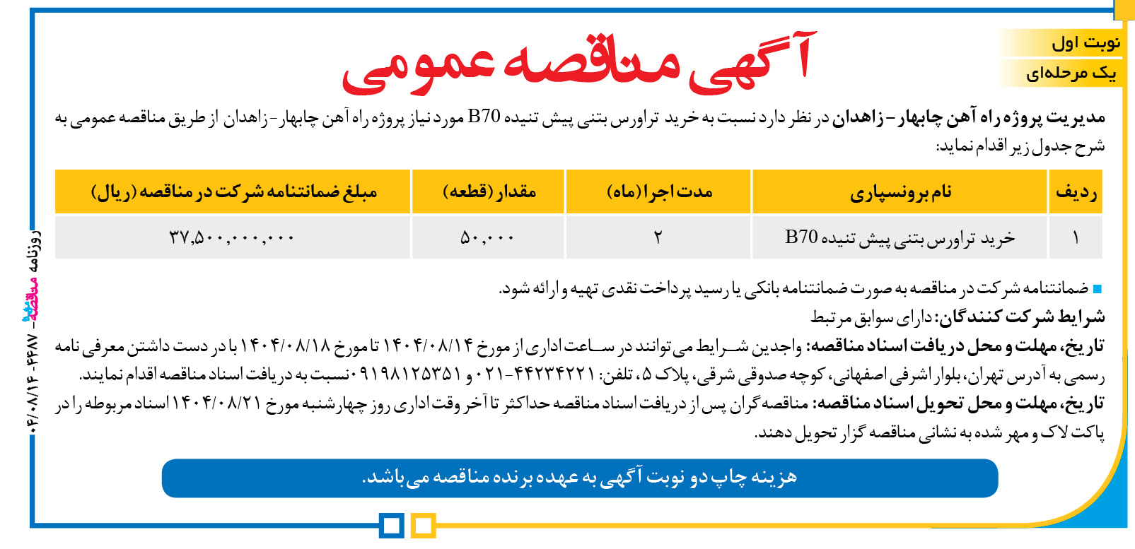 مدیریت پروژه راه آهن چابهار- زاهدان در نظر دارد نسبت به خرید تراورس بتنی پیش تنیده B70 مورد نیاز پروژه راه آهن چابهار- زاهدان از طریق مناقصه عمومی به شرح جدول زیر اقدام نماید: