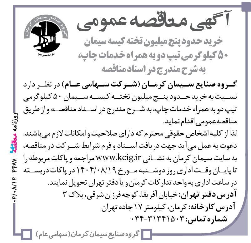 گروه صنایع سیمان کرمان (شرکت سهامی عام) در نظر دارد نسبت به خرید حدود پنج میلیون تخته کیسه سیمان ۵۰ کیلوگرمی تیپ دو به همراه خدمات چاپ، به شرح مندرج در اسناد مناقصه و از طریق مناقصهعمومی اقدام نماید. لذا از کلیه اشخاص حقوقی محترم که دارای صلاحیت و امکانات لازم میباشند. دعوت به عمل میآید جهت دریافت اسناد و فرم شرایط شرکت در مناقصه، به سایت سیمان کرمان به نشانی www.kcig.ir مراجعه و پاکات مربوطه را تا پایان وقت اداری روز دوشنبه مورخ ۱۹/۰۸/۱۴۰۴ در پاکات دربسته در ساعت اداری به واحد تدارکات کرمان و یا دفتر تهران تحویل نمایند.