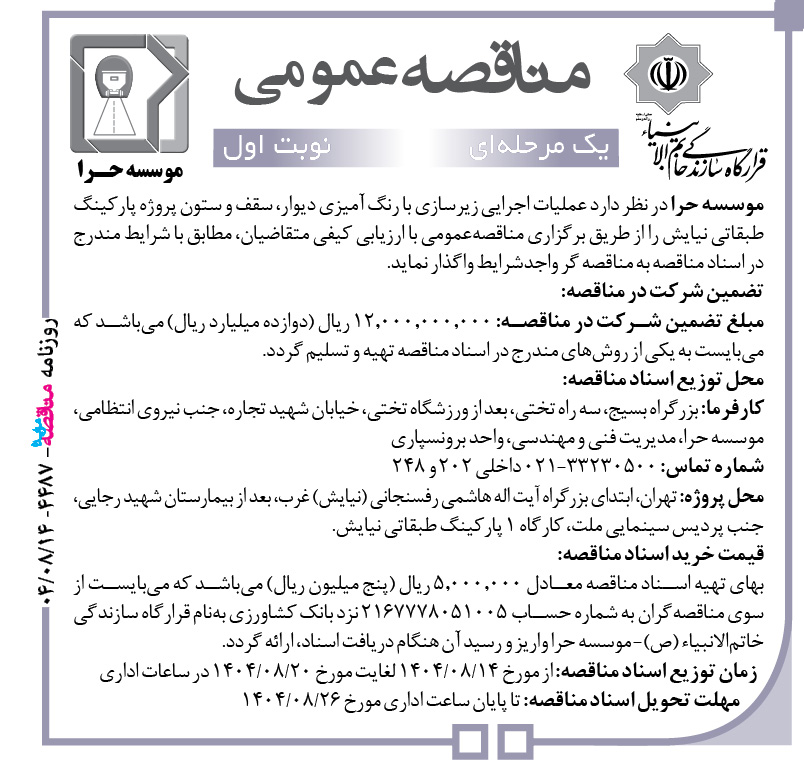 موسسه حرا در نظر دارد عملیات اجرایی زیرسازی با رنگ آمیزی دیوار، سقف و ستون پروژه پارکینگ طبقاتی نیایش را از طریق برگزاری مناقصهعمومی با ارزیابی کیفی متقاضیان، مطابق با شرایط مندرج در اسناد مناقصه به مناقصه گر واجدشرایط واگذار نماید.