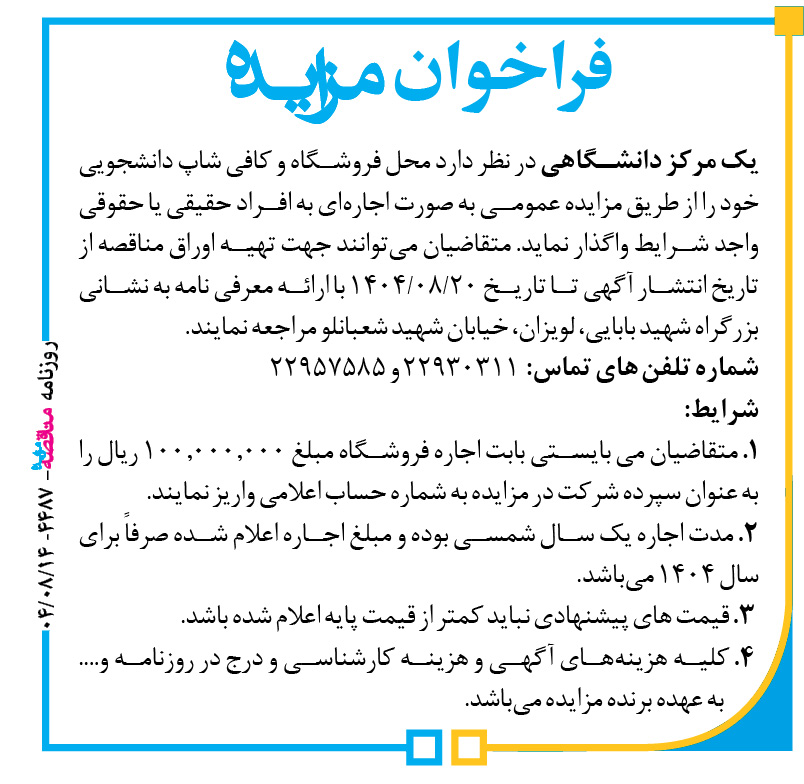 یک مرکز دانشگاهی در نظر دارد محل فروشگاه و کافی شاپ دانشجویی خود را از طریق مزایده عمومی به صورت اجارهای به افراد حقیقی یا حقوقی واجد شرایط واگذار نماید. متقاضیان میتوانند جهت تهیه اوراق مناقصه از تاریخ انتشار آگهی تا تاریخ ۲۰/۰۸/۱۴۰۴ با ارائه معرفی نامه به نشانی بزرگراه شهید بابایی، لویزان، خیابان شهید شعبانلو مراجعه نمایند.