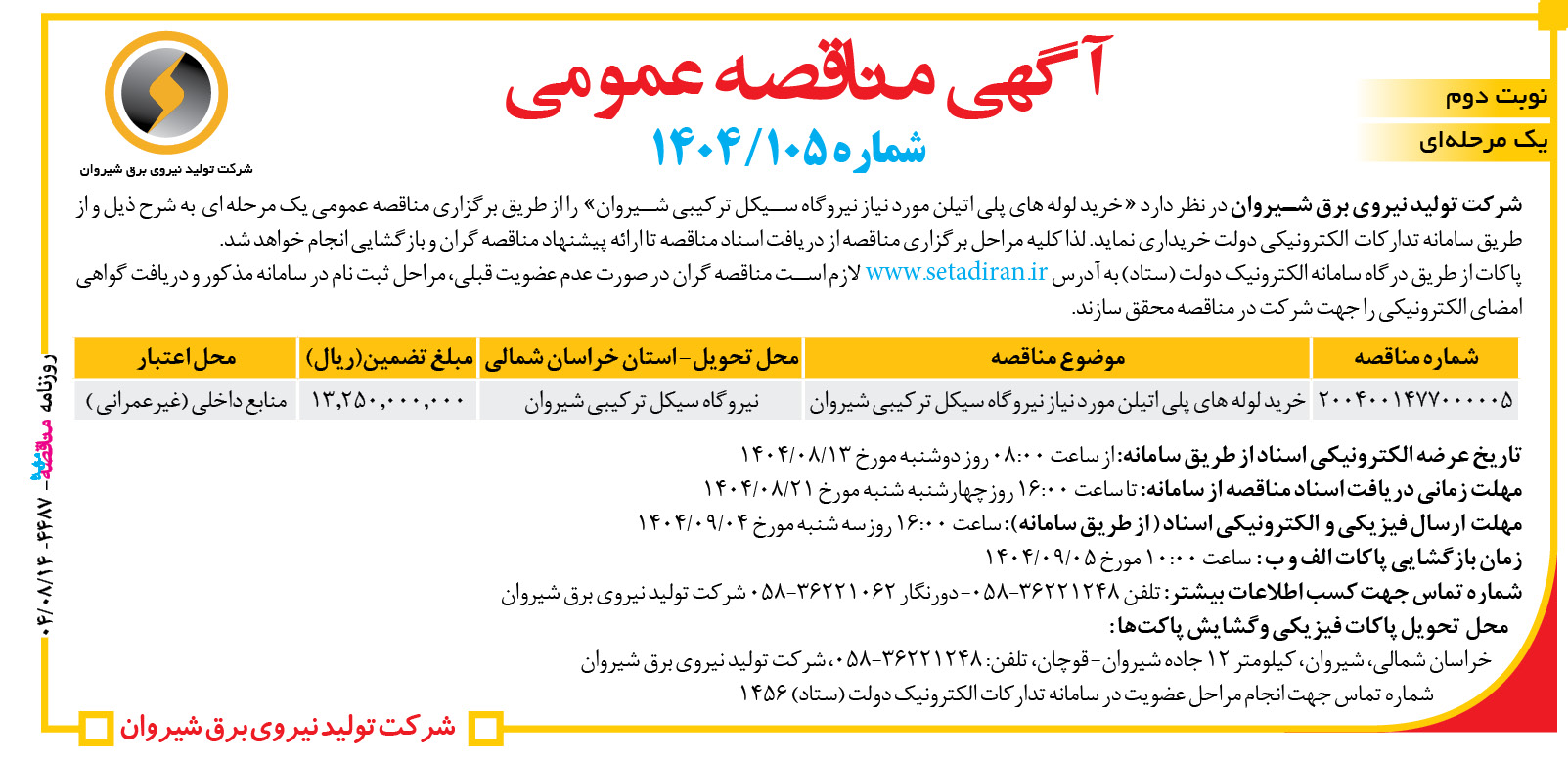شرکت تولید نیروی برق شیروان در نظر دارد ” خرید لوله های پلی اتیلن مورد نیاز نیروگاه سیکل ترکیبی شیروان” را از طریق برگزاری مناقصه عمومی یک مرحله ای به شرح ذیل و از طریق سامانه تدارکات الکترونیکی دولت خریداری نماید. لذا کلیه مراحل برگزاری مناقصه از دریافت اسناد مناقصه تا ارائه پیشنهاد مناقصه گران و بازگشایی انجام خواهد شد. پاکات از طریق درگاه سامانه الکترونیک دولت (ستاد) به آدرس www.setadiran.ir لازم است مناقصه گران در صورت عدم عضویت قبلی، مراحل ثبت نام در سامانه مذکور و دریافت گواهی امضای الکترونیکی را جهت شرکت در مناقصه محقق سازند.
