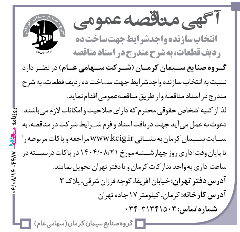 گروه صنایع سیمان کرمان (شرکت سهامی عام) در نظر دارد نسبت به انتخاب سازنده واجدشرایط جهت ساخت ده ردیف قطعات، به شرح مندرج در اسناد مناقصه و از طریق مناقصهعمومی اقدام نماید. لذا از کلیه اشخاص حقوقی محترم که دارای صلاحیت و امکانات لازم میباشند. دعوت به عمل میآید جهت دریافت اسناد و فرم شرایط شرکت در مناقصه، به سایت سیمان کرمان به نشانی www.kcig.ir مراجعه و پاکات مربوطه را تا پایان وقت اداری روز چهارشنبه مورخ ۲۱/۰۸/۱۴۰۴ در پاکات دربسته در ساعت اداری به واحد تدارکات کرمان و یا دفتر تهران تحویل نمایند.