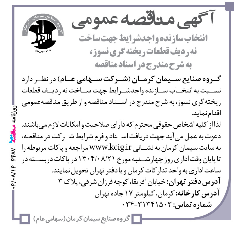 گروه صنایع سیمان کرمان (شرکت سهامی عام) در نظر دارد نسبت به انتخاب سازنده واجدشرایط جهت ساخت نه ردیف قطعات ریخته گری نسوز، به شرح مندرج در اسناد مناقصه و از طریق مناقصهعمومی اقدام نماید. لذا از کلیه اشخاص حقوقی محترم که دارای صلاحیت و امکانات لازم میباشند. دعوت به عمل میآید جهت دریافت اسناد و فرم شرایط شرکت در مناقصه، به سایت سیمان کرمان به نشانی www.kcig.ir مراجعه و پاکات مربوطه را تا پایان وقت اداری روز چهارشنبه مورخ ۲۱/۰۸/۱۴۰۴ در پاکات دربسته در ساعت اداری به واحد تدارکات کرمان و یا دفتر تهران تحویل نمایند.