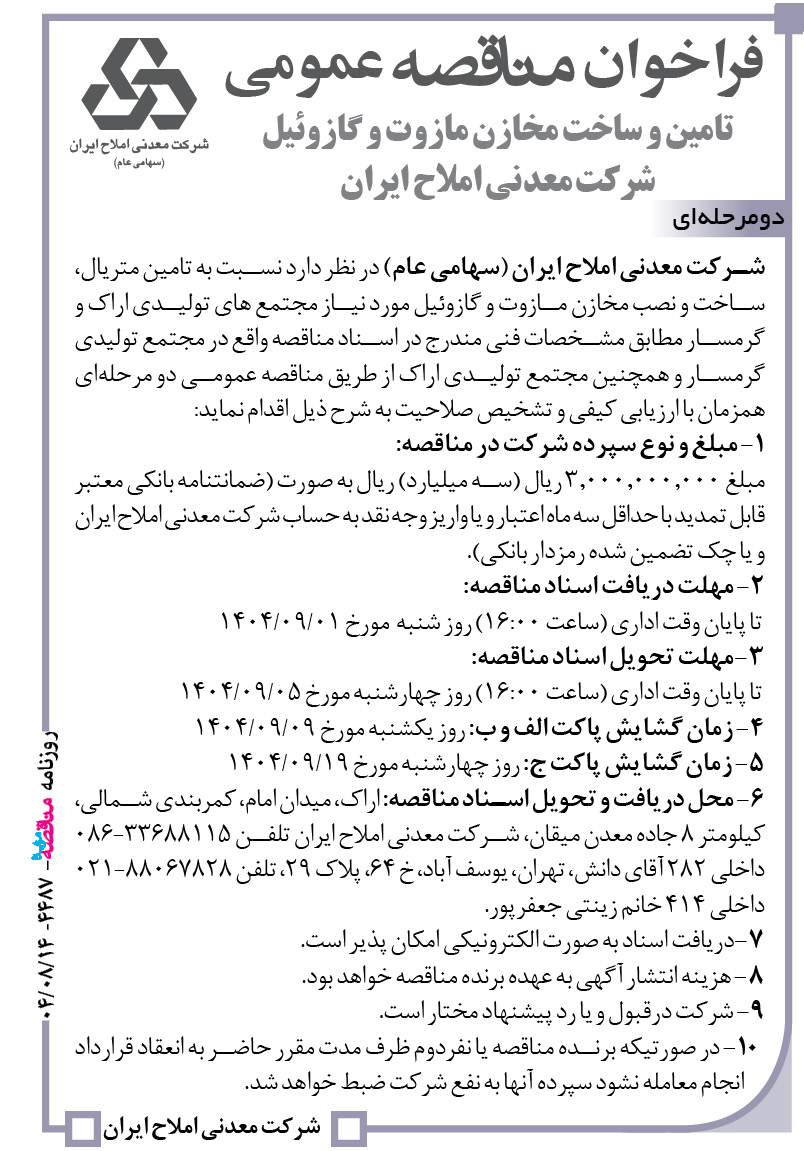 شرکت معدنی املاح ایران (سهامی عام) در نظر دارد نسبت به تامین متریال، ساخت و نصب مخازن مازوت و گازوئیل مورد نیاز مجتمع های تولیدی اراک و گرمسار مطابق مشخصات فنی مندرج در اسناد مناقصه واقع در مجتمع تولیدی گرمسار و همچنین مجتمع تولیدی اراک از طریق مناقصه عمومی دو مرحلهای همزمان با ارزیابی کیفی و تشخیص صلاحیت به شرح ذیل اقدام نماید: