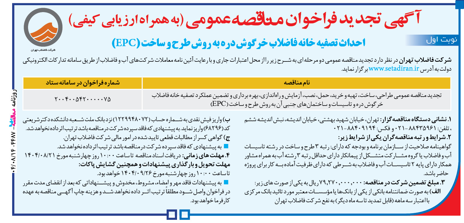 شركت فاضلاب تهران در نظر دارد تجدید مناقصه عمومی دو مرحله ای به شرح زیر را از محل اعتبارات جاری و با رعايت آئین نامه معاملات شرکتهای آب و فاضلاب از طریق سامانه تدارکات الکترونیکی دولت به آدرس www.setadiran.ir برگزار نماید.