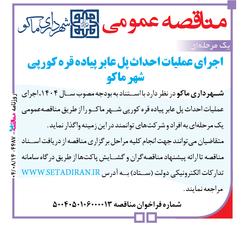 شهرداری ماکو در نظر دارد با استناد به بودجه مصوب سال ۱۴۰۴، اجرای عملیات احداث پل عابر پیاده قره کورپی شهر ماکو را از طریق مناقصهعمومی یک مرحلهای به افراد و شرکتهای توانمند در این زمینه واگذار نماید .
