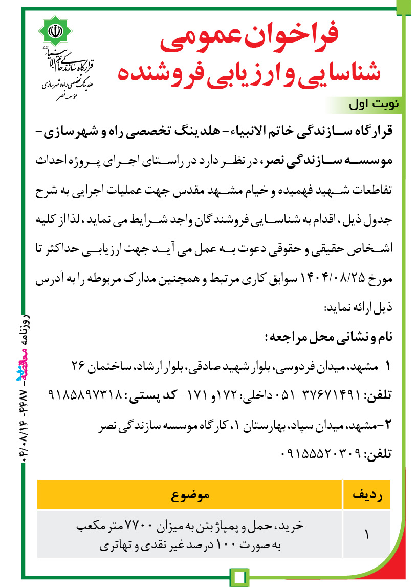 قرارگاه سازندگی خاتم الانبیاء – هلدینگ تخصصی راه و شهرسازی – موسسه سازندگی نصر ، در نظر دارد در راستای اجرای پروژه احداث تقاطعات شهید فهمیده و خیام مشهد مقدس جهت عملیات اجرایی به شرح جدول ذیل ، اقدام به شناسایی فروشندگان واجد شرایط می نماید ، لذا از کلیه اشخاص حقیقی و حقوقی دعوت به عمل می آید جهت ارزیابی حداکثر تا مورخ ۲۵/۰۸/۱۴۰۴ سوابق کاری مرتبط و همچنین مدارک مربوطه را به آدرس ذیل ارائه نماید: