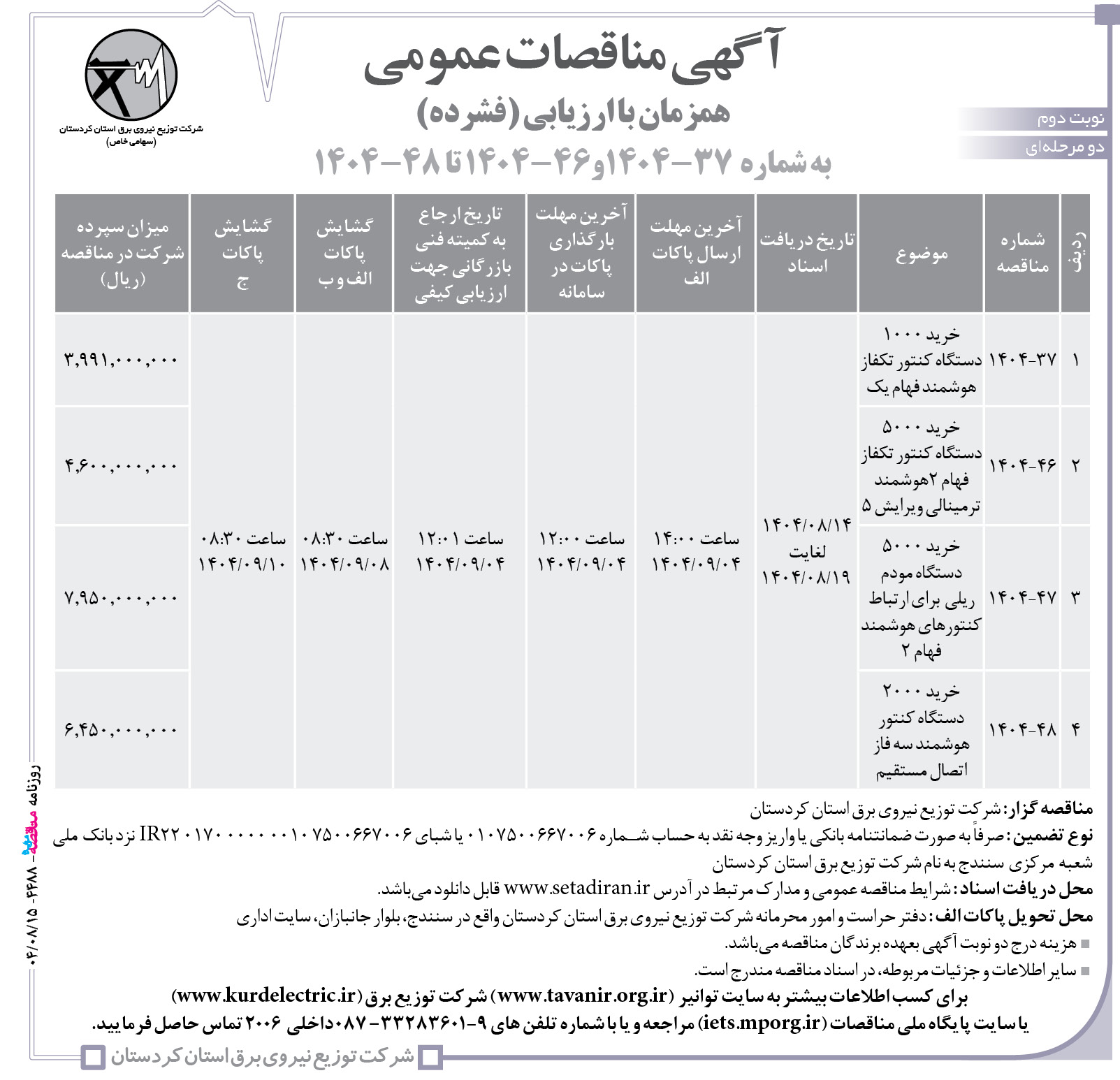 براي كسب اطلاعات بيشتر به سايت توانير (www.tavanir.org.ir ) شركت توزيع برق (www.kurdelectric.ir) يا سايت پايگاه ملي مناقصات (iets.mporg.ir) مراجعه و يا با شماره تلفن هاي ۹-۳۳۲۸۳۶۰۱– ۰۸۷ داخلي ۲۰۰۶ تماس حاصل فرماييد.